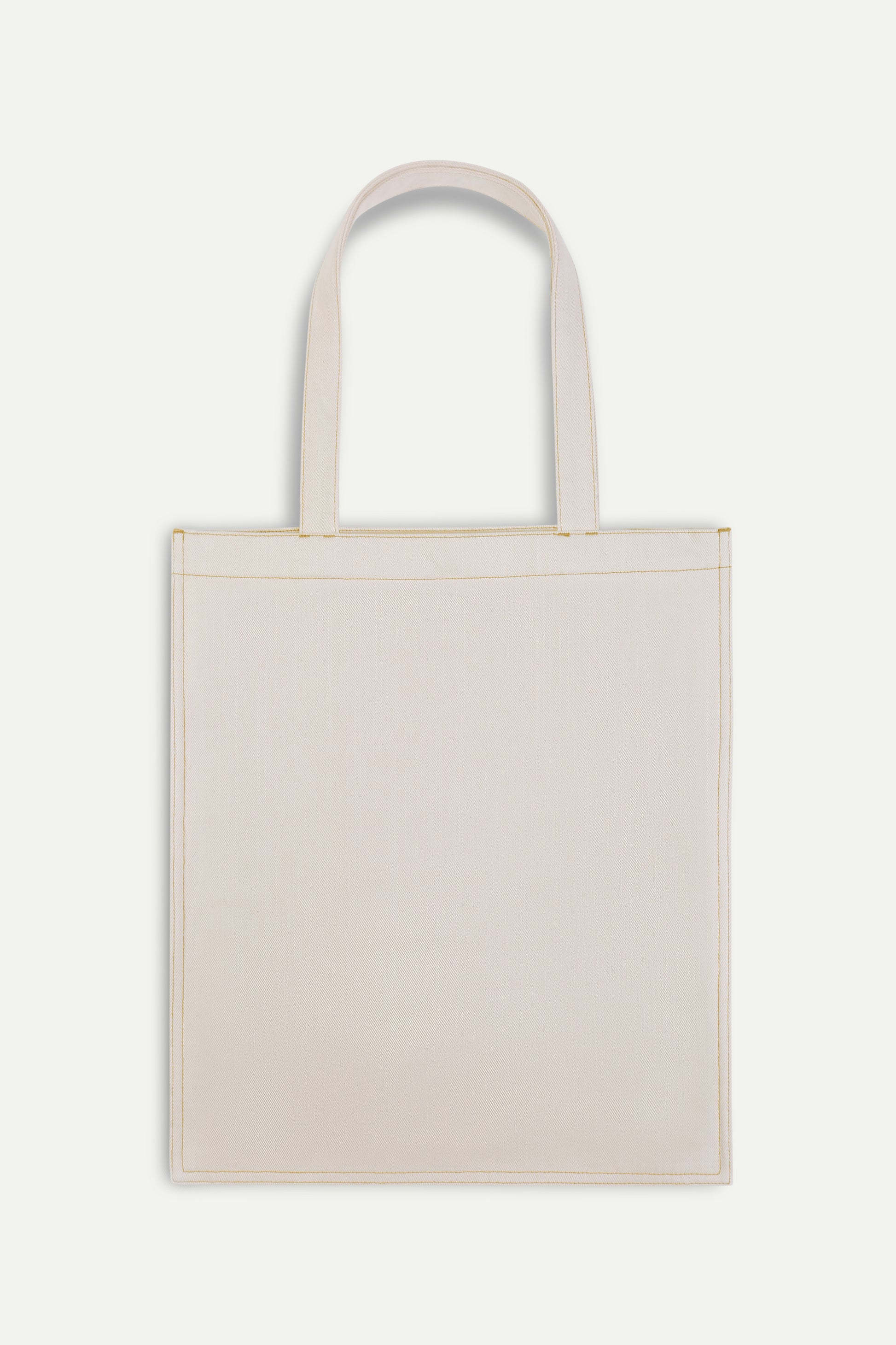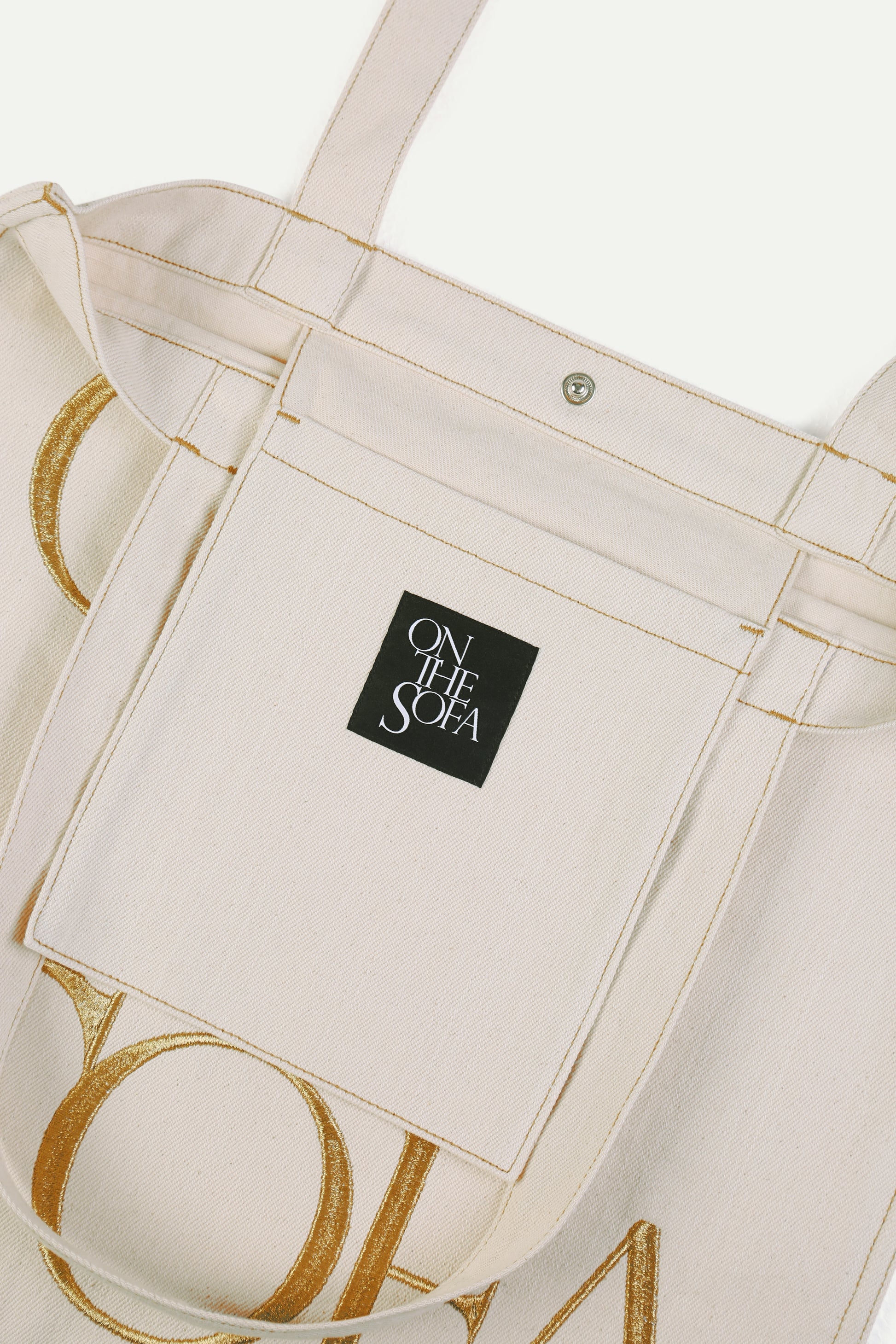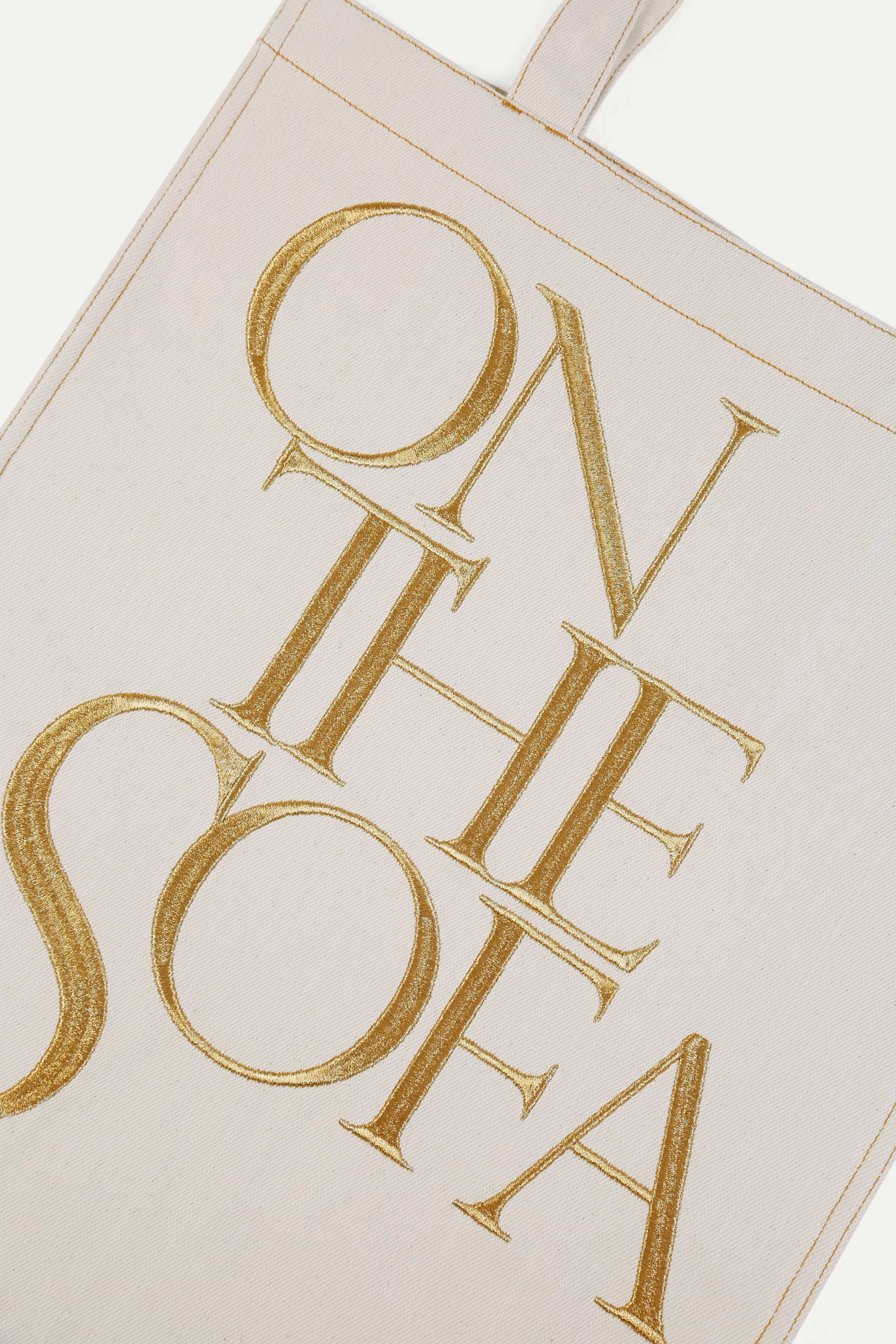 Helios: Warm-toned white canvas embroidered with threads and lettering in metallized gold.