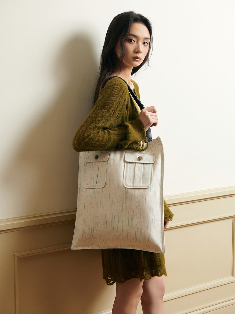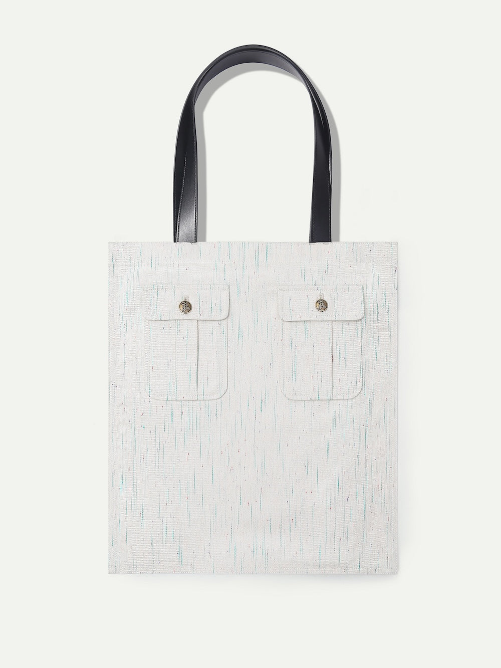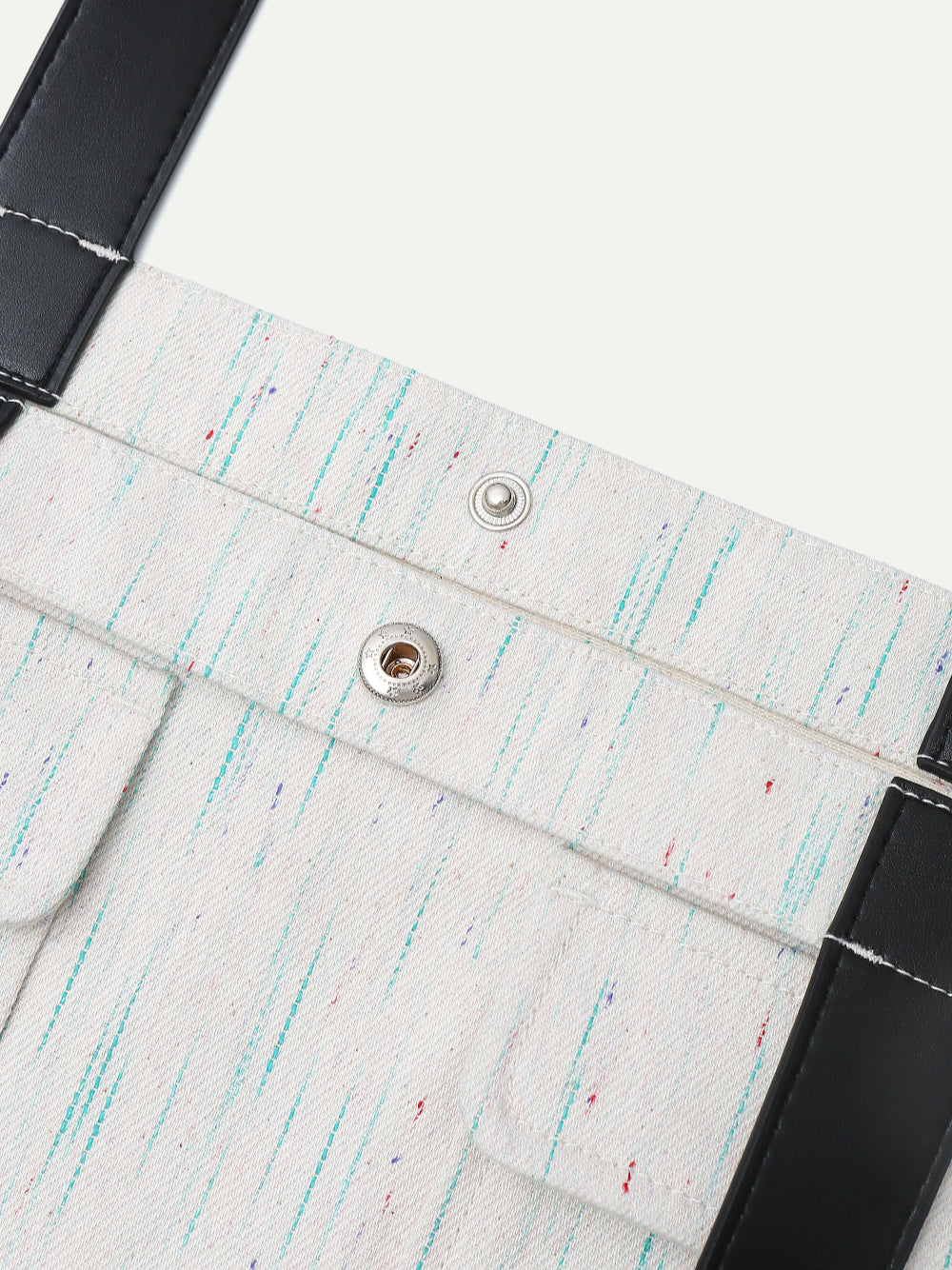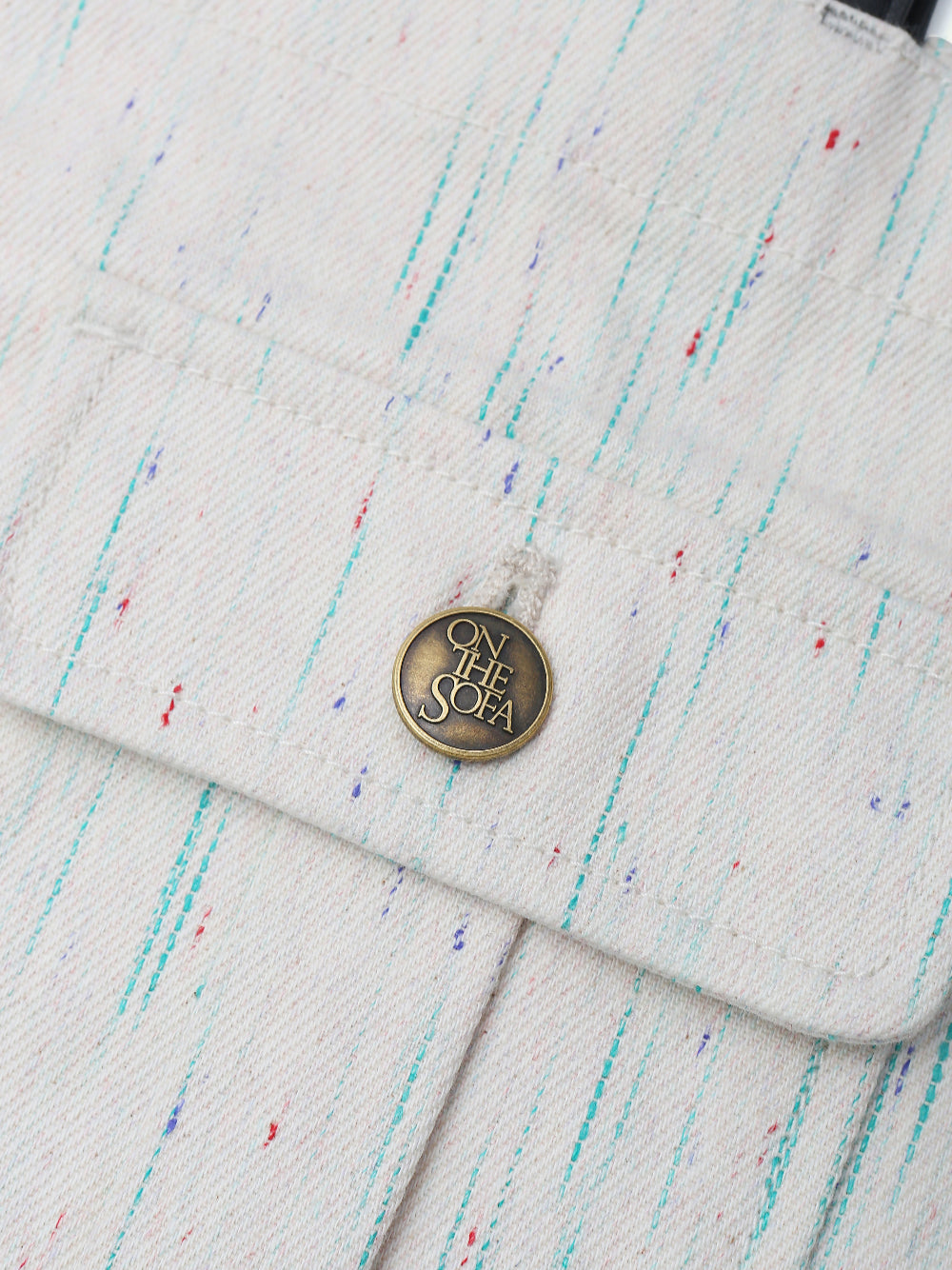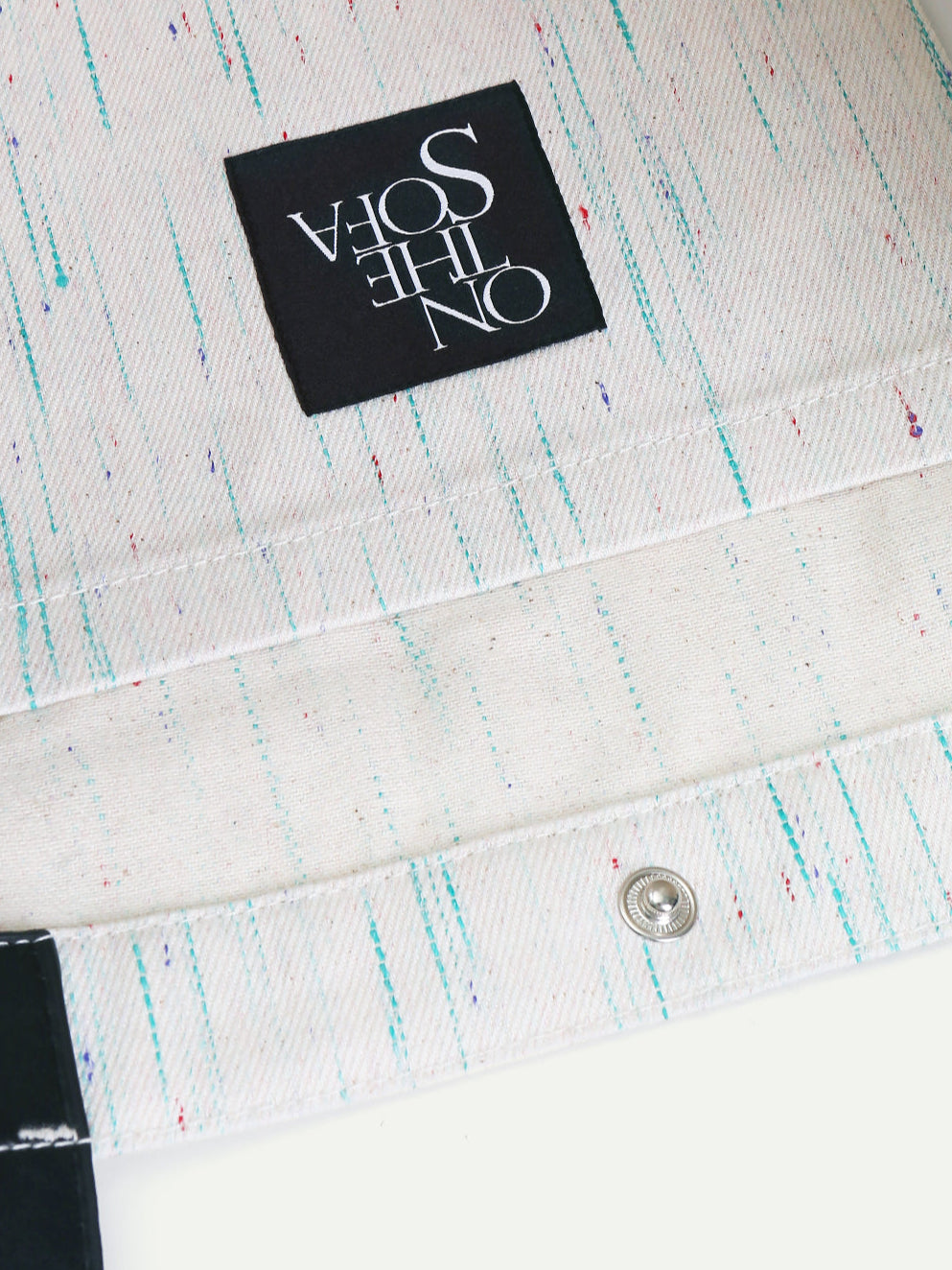 Encapsulate all your flavorful memories within Sofa Safari. The collection embraces a blend of style and durability, crafted from resilient cotton-canvas adorned with a captivating abstract pattern in vibrant, spliced colors. The distinctive design of symmetrical cargo pockets with embossed brass buttons adds a utilitarian and enduring touch. Carry it through its supple leather straps.